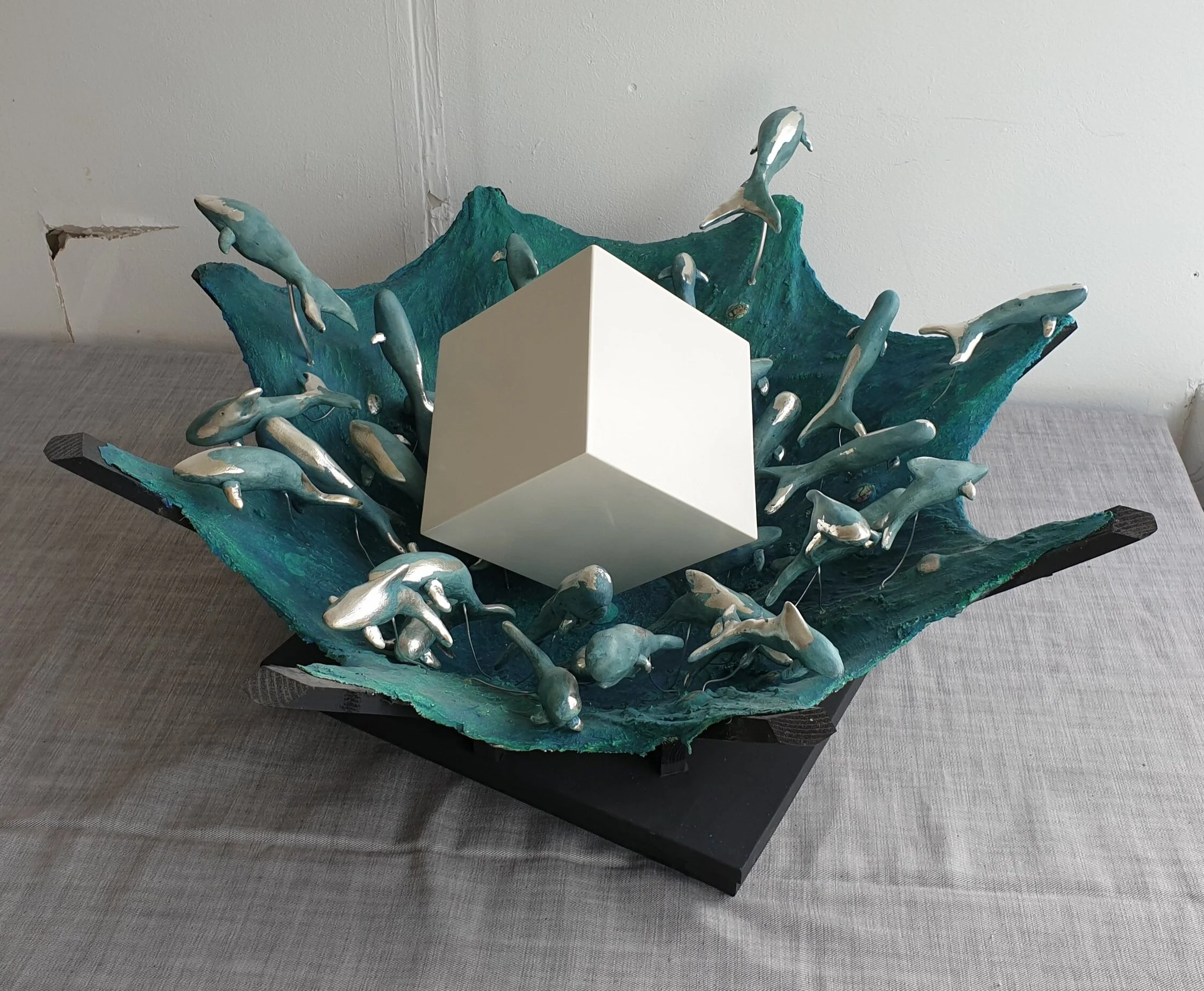 35(ish) Hand Sculpted and Gilded Whales, around a Gesso Cube, seated within Plaster Crown with Abalone inlay.